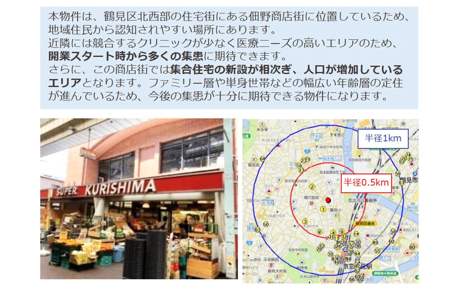 ・近隣には競合するクリニックが少なく医療ニーズの高いエリアのため、開業スタート時から多くの集患に期待できます