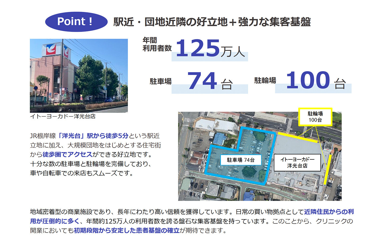 徒歩・自転車・バスなどの多様な交通手段で来店が可能なため、駅利用者はもちろん、周辺の団地や戸建て住宅からもアクセスしやすく、幅広い世代のショッピング拠点となっています