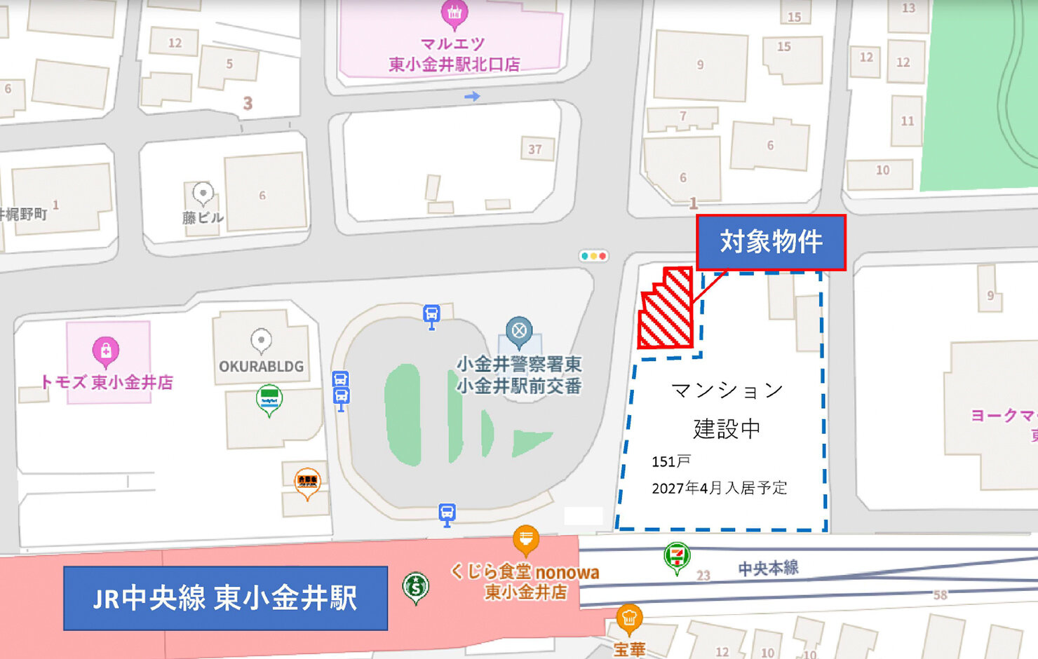再開発エリアで同区画内で151戸のマンションを建設中、2027年4月に入居開始の予定です